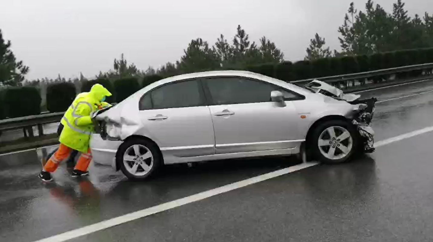 事故小车抛锚在超车道上,车上是一家四口,一对夫妻和一双儿女,司机的妻子带着两个小孩站在路侧的护栏外面,而司机却在车旁边手忙脚乱的指挥车辆避让,同时,甚至有过路车辆在应急车道停下来看热闹,现场十分危急,洪门养护站的养护人员到达现场后第一时间在事故车前方300米开始用安全锥对超车道进行渠化,引导车辆提前变道到行车道。完成这项工作后,对现场事故车辆状态进行确认,发现车辆虽不能正常行驶,但可以挂至空挡,为有效防止后方车辆因避让不及产生的二次事故,于是决定将事故车辆推至应急车道。此时,雨越下越大,两名养护人员淋着雨推着车,司机操控着方向盘,乘客在护栏外帮注意后方来车。由于路面湿滑,推车的养护人员脚下滑了又滑,但不能阻挡他们坚定前行的步伐,在养护人员和司乘人员的共同努力下终于将车辆推到了应急车道上。