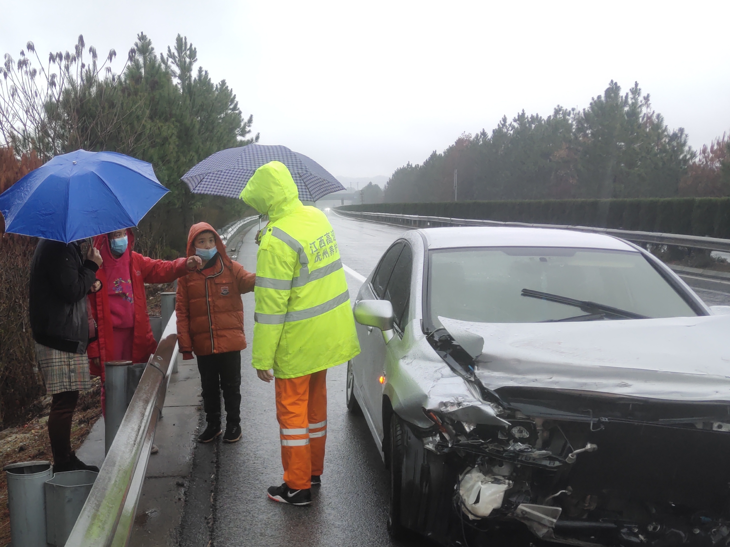 在完成了现场定损后,养护人员将超车道渠化撤除,恢复超车道的正常通行。这时养护人员发现司乘一家四人孤零零的现在路侧,手里只有一把小雨伞,一名小朋友和司机在雨中淋雨,身上的衣服已经湿透了,养护人员赶紧从车上拿出自己的雨伞递到小朋友手中,对他说:小朋友,叔叔的伞给你们,别凉着了。在等拖车的时候别乱跑,记得站到护栏外面。小朋友羞涩的点头说了声谢谢,养护员口罩下露出了开心的笑脸。
