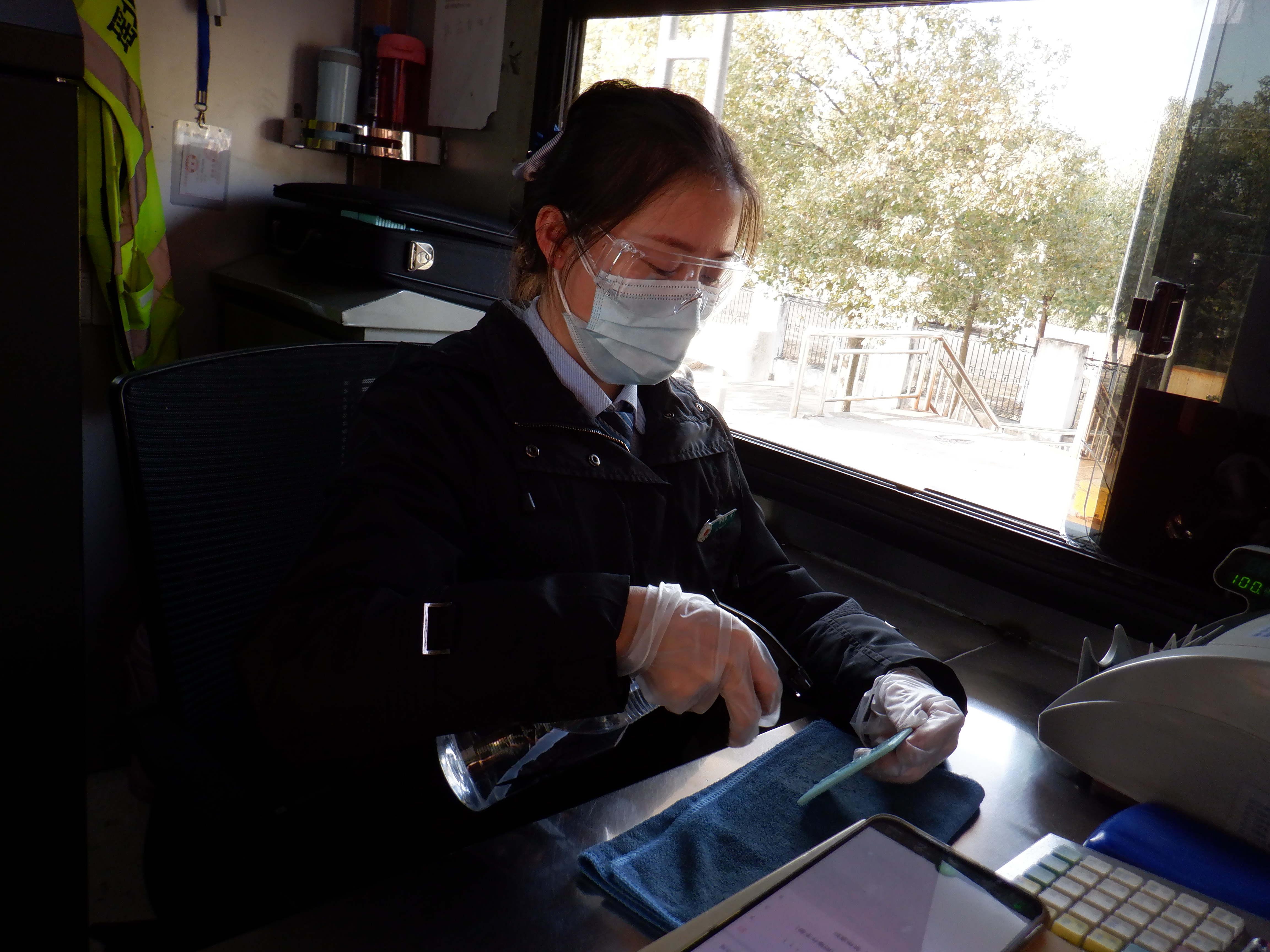 每天面对来自四方八方的司乘,收费员们在上岗前,每班次都按照要求测好体温,并配备了酒精、免洗水液,提醒收费员工注意手部卫生。同时始终坚持做好上岗防护措施,即三戴一喷:口罩、手套、护目镜上岗8小时戴一戴,CPC卡片酒精喷一喷。