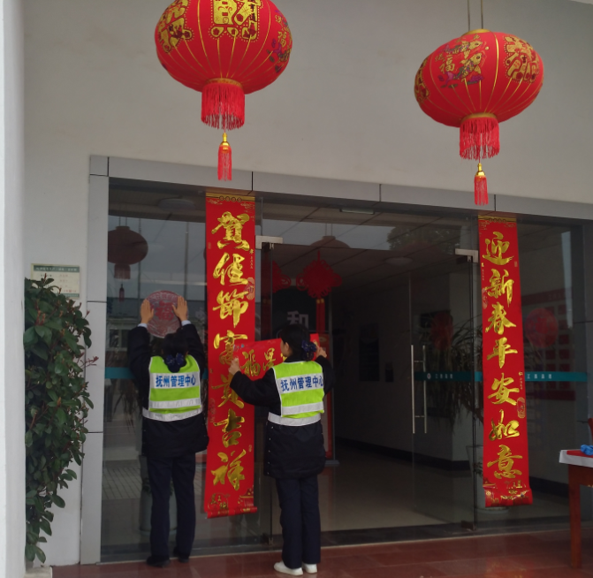 原来,该所为了使员工过个有意义的春节,以“所站是我家,变美靠大家”为主题,组织员工自行装扮所站庭院活动。上午10时许,随着该所负责人的一声令下,装扮活动火热开始,有的女生拿着小灯笼追逐着跑去挂在树枝上,有的两两配合,贴着福字窗花、还有的对着帐对联的同事在讨论着上联应贴在左边或右边,整个庭院像一大家子忙开了花。经过近一小时的装扮,将该所组织人员采购了的100余个大小灯笼, 50余件中国结及福字窗花等,妥妥地点在该所庭院内的树枝上、门窗上、走廊内,庭院内跳动着火热的中国元素,大伙像年画中的祝福牛一样,个个喜笑颜开,难怪小陈与小罗俩小女生会交口称赞。