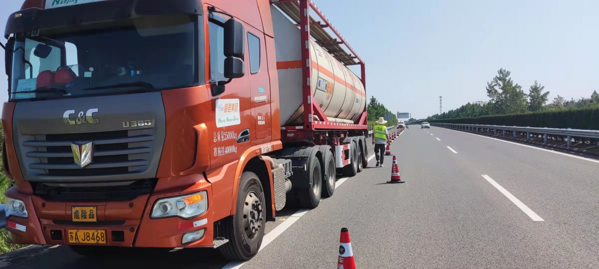 事故车辆系一辆运载危化品的重型货车,现场无人员伤亡,未造成路损,救援人员在勘察完事故现场后,立即通知抢修队前往现场对车辆进行了换胎抢修,10点49分,事故点的故障车处理完毕,道路恢复了正常通行。