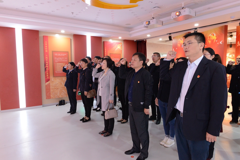 在入党宣誓厅,百余名党员排列整齐,面向党旗,举起右手,庄严宣誓,坚定有力的声音在宣誓厅内久久回荡。
