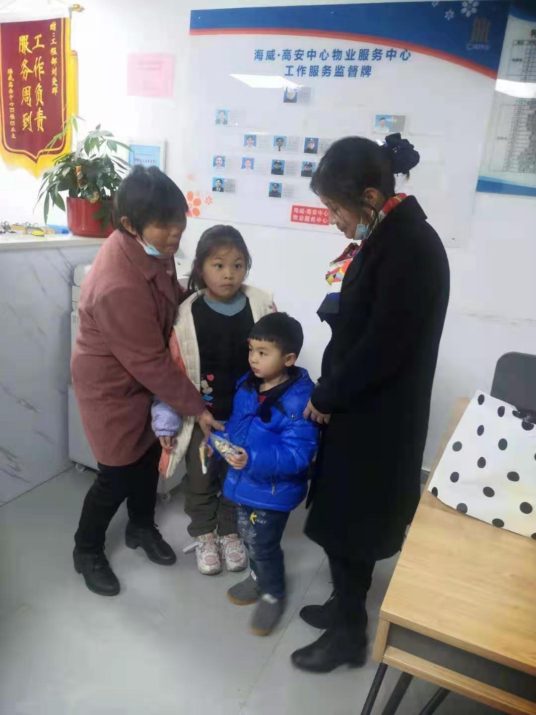 “宝贝你叫什么名字?爸爸妈妈呢?住哪里呀?”“宝贝,别哭了,阿姨给你糖和饼干”,恒辉物业高安中心物业服务中心工作人员在小区门口对一名哭泣的走失男孩亲切地询问,经过一番努力,成功地把孩子安全送回了家。