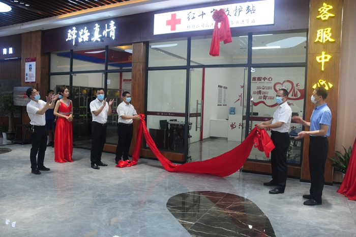 会上,段卫党与刘华鹰共同为全省首个高速公路服务区红十字救护站揭牌。揭牌仪式后,与会人员参观了服务区红十字救护站。红十字救助站人员还现场开展了应急救护技能演练。
