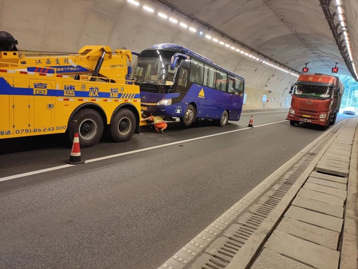 国庆期间,车流量大,隧道非常危险,增加了救援难度。接警后,梓山车辆救援队第一时间赶往事故现场,同时联系监控室将行车道指示灯改为禁止通行,避免后车追尾。到达现场后,队员们立即开展安全布控作业,并将受困乘客安排至隧道出口安全区,等待转运车辆。14时17分大客车被拖离隧道,道路恢复正常通行。