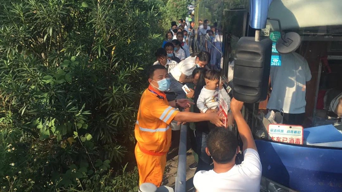 接到报警电话后杨梅岭车辆救援队火速出警,抵达之后迅速做好安全布控,并安排巡逻车在后方预警。由于大巴车靠近护栏板处,车门无法打开,为确保乘客人身安全,队员们协助乘客有序从车窗口爬出,并引导乘客转移至护栏板外安全区,才开始拖车作业,最终成功将所有司乘安全护送下高速。