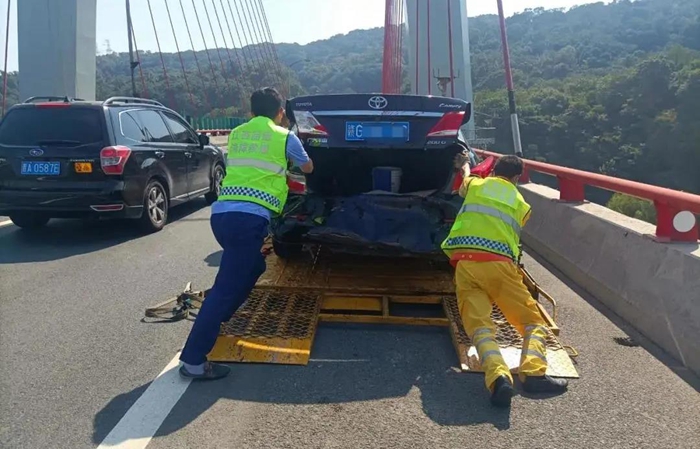 10月6号上午10时许,鄱阳湖大桥发生一起车辆追尾事故,造成桥面短暂拥堵。在雁烈山隧道临时驻点值守的车辆救援队以最快速度赶到现场。
