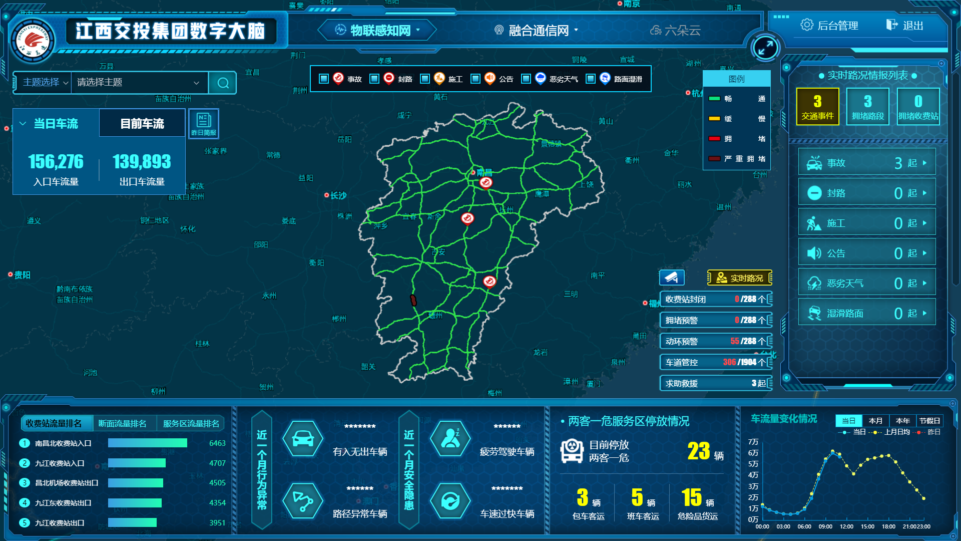 “智能检测+精准预警”。路况信息的及时准确掌握离不开科技的保驾护航,路网运营公司紧跟发展大势,大力推进路网信息化建设,对江西省交通投资集团现有机电、网络等设施设备等进行数字化改造,通过“物联感知网”获取江西高速主线车流、车道状态、服务区运行、隧道状态等多方面数据和多维度实时态势,从而精准掌握在高速公路上穿行的物流、车流,及时地对相关路况作出预警判断。截至目前,该系统有效预警6000余次,准确率达90%以上,有效疏解了高速公路拥堵。