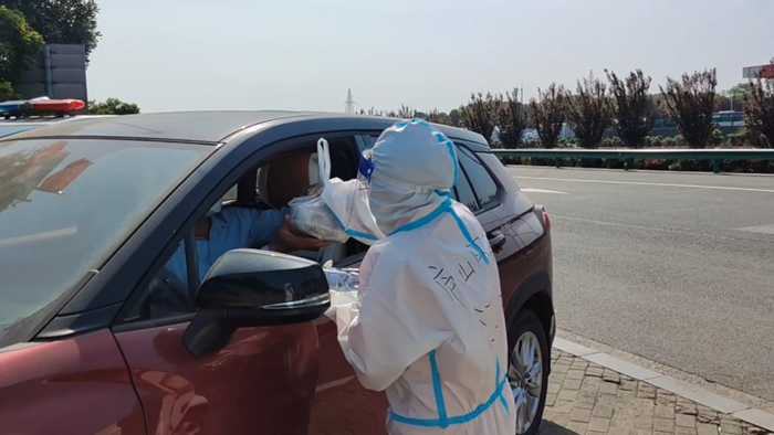 面对这种情况,刘洁漪为他们送去水果、矿泉水、饼干等补给物资,“这里有些吃的,您先拿着。目前要下高速需要‘抗原+核酸’双保险,之后我们的工作人员还会给您提供抗原检测试剂,需要麻烦您配合做一下检测,15分钟就出结果。”在服务区工作人员的帮助下,该司乘自行检测后结果一切正常。