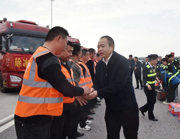 在服务区广场,谢兼法详细询问了物资运输情况,并与物资运输队成员一一握手,悉心叮嘱他们路上要相互照应、平安往返。谢兼法对大家说:“赣鄂两省一衣带水,两地交投人亲如一家。在应对极端恶劣天气的挑战时,我们要守望相助,心手相连,共克时艰,全身心投入到战风雪、保安全、护畅通的工作中去。”