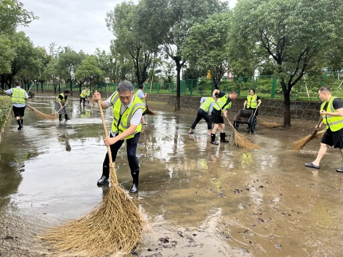 上午10时左右,经过大家5个多小时的努力,积水全部被清理完毕,办公院内堆积了不少被雨水冲刷下来的淤泥等杂物。随后,大家又拿起扫把、铁锹等工具,开始新一轮的清理工作,不留死角做好消杀。期间,58岁的熊云林,一头白发格外引人注意,他的衣服和发丝早已湿透,雨鞋里也灌满了泥水,但仍不停地挥动手中扫把清理杂物。他说:“扛不动沙袋,我就清理排水渠、清除淤泥等杂物 ,我们都想着能多出一份力就出一份力。”