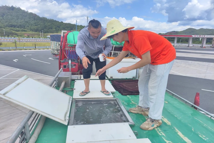 为了及时采取措施挽回司机损失,工作人员立即出发到附近乡镇上的兽药房买药,辗转多家药房后,终于找到了所需药品,并协助张师傅按照药品使用说明,将适量的药剂放入至鱼箱中,密切观察鱼群反应和恢复情况。半小时后,鱼群状况逐渐稳定,张师傅悬着的心也终于放下了。