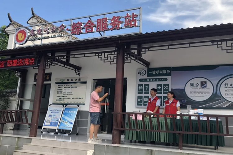 该中心充分利用LED屏、宣传展架等载体,及时发布路况信息和安全提示,引导广大司乘安全出行;并每天对车道、广场进行洒水降温,积极营造良好的通行环境。此外,在“高速映山红”综合服务站设置“清凉驿站”,为大家提供凉茶、藿香正气水等防暑用品。