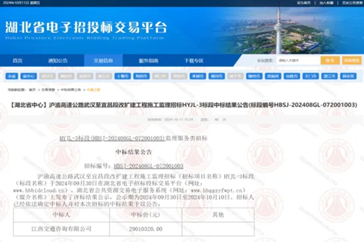 近日,咨询公司成功中标沪渝高速武汉至宜昌段改扩建工程(简称“汉宜高速改扩建”)施工监理HYJL-3标段,中标价为2901.032万元,这也是公司首次在湖北省成功中标监理项目。