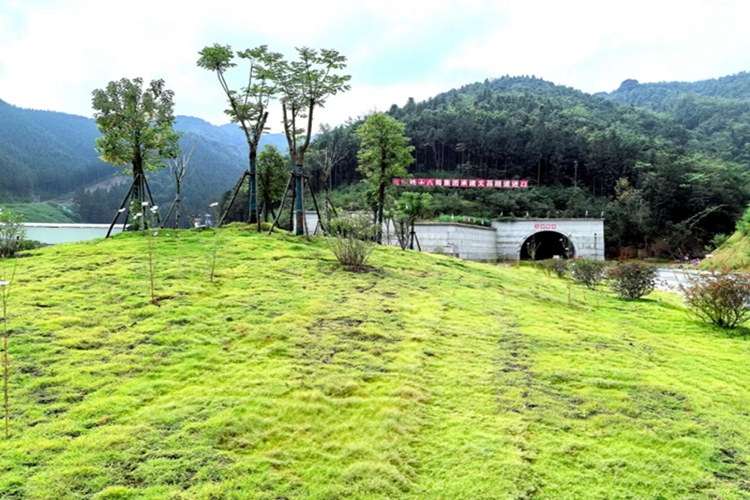在传统的高速公路建设中,分离式路基中分带往往只是简单的隔离区域,功能单一。遂大高速R2总监办和B2标项目部巧妙利用自然地形特点,将遂大高速文昌隧道进口端区域分离式路基中分带打造成高低起伏、错落有致的“微地形”景观,使雨水能够自然渗透和储存,减少水土流失。在打造过程中,总监办充分考虑生态环保理念,选用适应性强、耐旱耐寒的本地植物品种,降低养护成本。