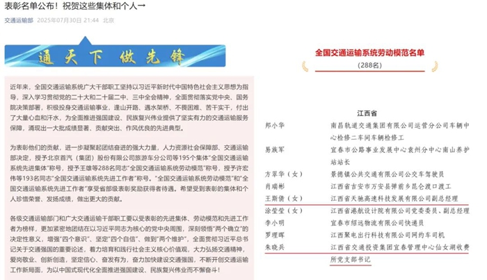 近日,交通运输部公布了全国交通运输系统先进集体劳动模范和先进工作者评选表彰名单。其中,咨询集团天驰公司王斯倩、宜春管理中心仙女湖收费所朱晓兵获评全国交通运输系统劳动模范。
