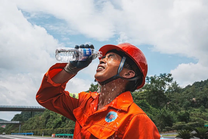 作为一名养护维修队员,易金财和工友们正加紧更换高速护栏板。烈日炙烤下,金属护栏烫得灼手,工作如同置身“桑拿房”。“500毫升的矿泉水,我一天至少干掉10瓶!”易金财说,大量喝水是他们对抗高温、预防中暑最直接的方式。