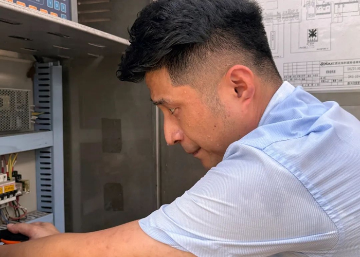 由于长时间暴晒,收费岗亭旁的金属设备外壳滚烫。朱文聪顾不上擦拭满脸汗水,迅速打开工具箱蹲下排查。“设备不修好,车道就没法正常运转,必须抢时间!”他一边调试电路,一边对同事说道。豆大的汗珠不断滑落模糊视线,他只用袖子胡乱一抹,手中的动作却一刻不停。