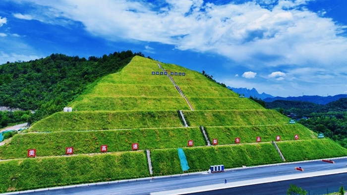 生态修复稳固边坡:梨东改扩建A1标在边坡采用生态砌块工艺,兼具稳固性与透水性的灰色预制墙砖,与“美铸自然”等绿色标语及周边植被相映成趣,形成流动的生态文化风景线。昌金改扩建SSZ2标则应用"菱形植生袋+生态喷涂砂浆"技术,成功治理边坡滑塌难题。监测数据表明,治理后的边坡各项指标稳定,新生植被长势良好,已形成良性的生态防护系统。