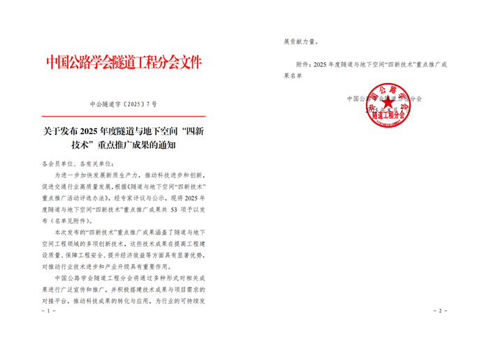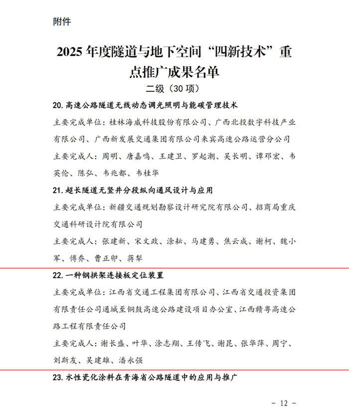 近日,中国公路学会隧道工程分会公布2025年度隧道与地下空间“四新技术”重点推广成果名单,由交工集团通铜T3标研发的“钢拱架连接板定位装置”入选。