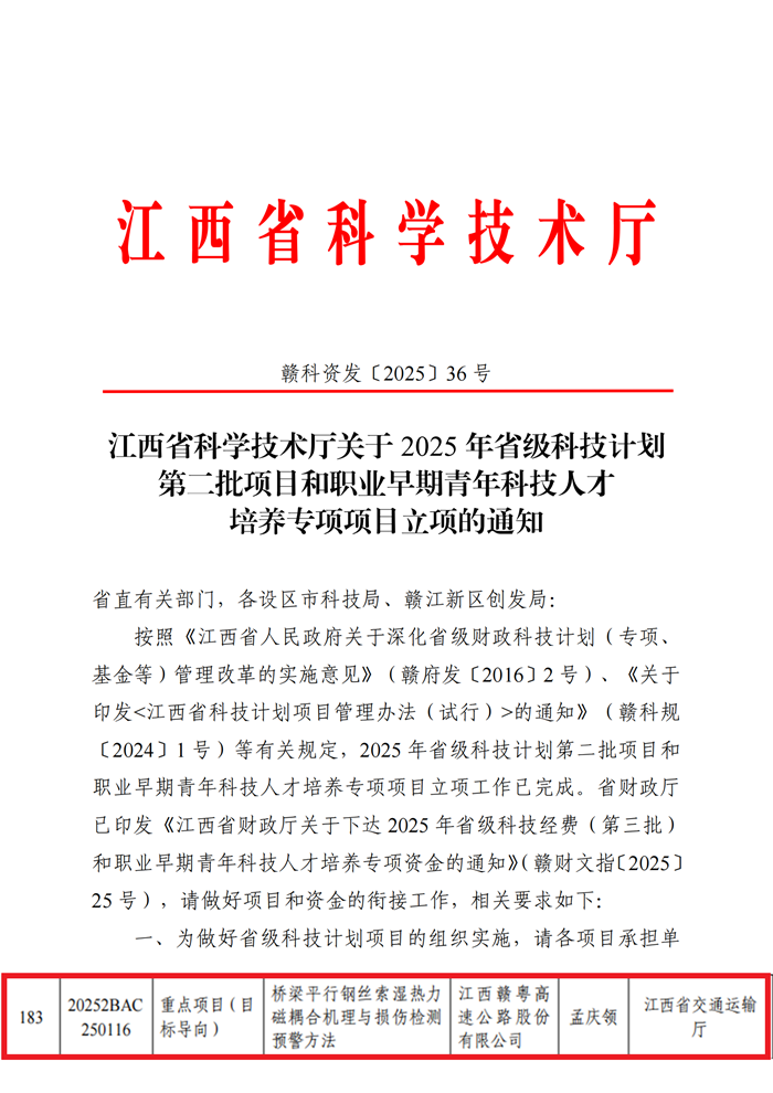 近日,江西省科学技术厅发布关于2025年省级科技计划第二批项目和职业青年科技人才培养专项项目立项的通知,赣粤高速申报的《桥梁平行钢丝索湿热力磁耦合机理与损伤检测预警方法》成功获批江西省自然科学基金重点项目(目标导向类)。据悉,该类项目全省仅获批17项。