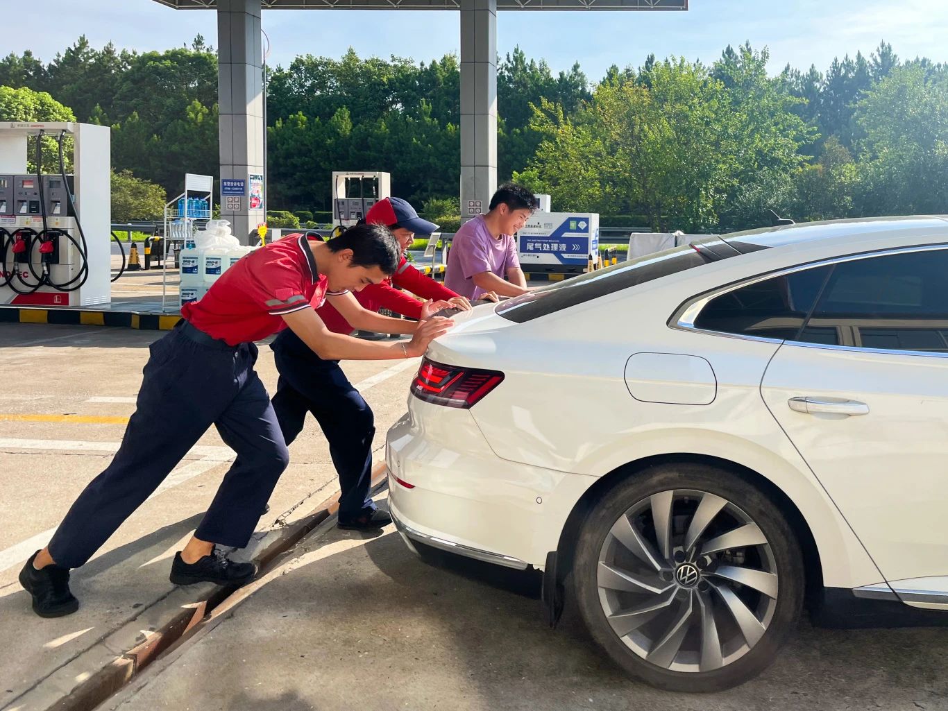 车辆抛锚,众人合力搭把手 8月17日,在泰和东服务区加油站里,一辆汽车刚进站、引擎却突然“哑”了火,车主反复拧着钥匙,车子没有丝毫动静。站内工作人员纷纷上前帮忙:“师傅,我们帮您把车挪到边上吧,这样也方便检查。”随着一声招呼,几人合力将车推到了站房旁的安全区域,等待修理厂师傅前来检修。待车子修好后,车主特意摇下车窗冲员工们笑了笑:“刚才还有点犯愁,这下稳当了!”