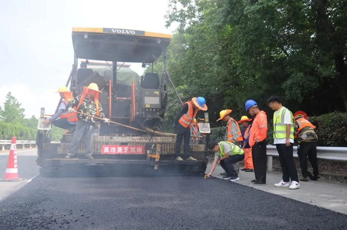 路面攻坚,抢抓施工黄金期:深入实施“一路一策”精准养护方案,通过科学调配机械设备及人力资源,确保养护作业高效推进。针对持续高温天气,严格落实“早晚错峰、中午休整”的弹性作业机制,为一线养护人员配足配齐清凉饮品、防暑药品等防暑物资,在保障作业人员职业健康安全的同时,全力推进工程进度。在都九高速K17公桩上行路段施工现场,铣刨机、摊铺机和压路机组成流水作业线协同施工。养护技术人员采用红外测温仪实时监测沥青混合料温度,严格控制摊铺厚度和平整度,确保各项工序规范达标。
