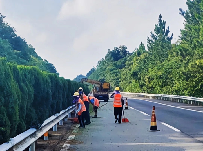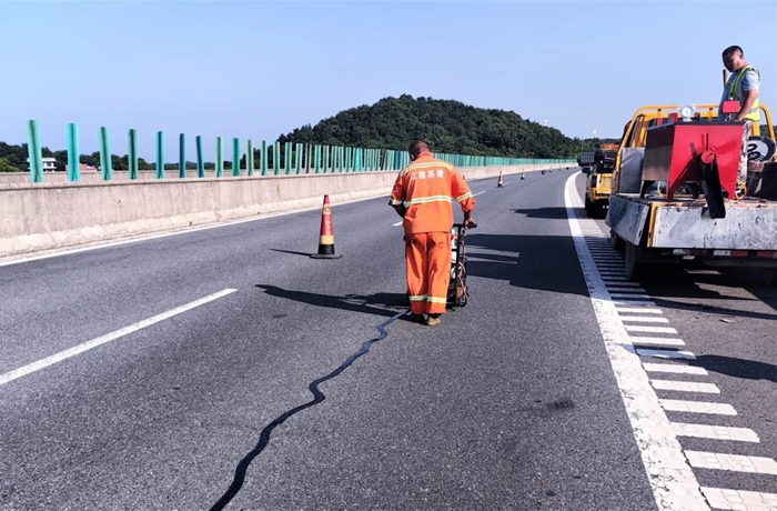裂缝精修,消除道路隐患点:借助智能巡检系统,对路面病害图像进行精准识别分析,依据分析结果对辖区内路面的裂缝、坑槽等病害展开精细化排查,在杭瑞高速K375公桩处,养护工作人员针对路面隐患,进行高压清吹、精准注胶、刮平修复,以规范化施工保证路面修复效果。针对夏秋季节雨水多发的特性,采取集约化施工方式,做好沿线边沟区域的深度清淤、集水井防堵加固、隧道桥梁高边坡加密巡查等工作,从源头杜绝积水隐患,为行车安全筑牢防线。