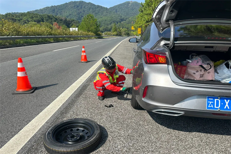 10月1日上午,一辆小客车行驶至泉南高速石吉段时突发爆胎,吉安东车辆救援大队宁都中队救援人员及时伸出援手,帮助车主脱困。当时,救援人员执行任务返程途中发现小客车滞留后立即做好安全布控,上前了解情况。得知车主是从福建自驾回云南老家过节,途中突遇轮胎故障,又未携带备用工具,正不知所措。救援人员随即从救援车上搬下工具,俯身在车旁忙活起来——拆卸旧胎、安装备胎、拧紧螺丝,动作娴熟利落。短短十几分钟,备用轮胎便更换完毕。