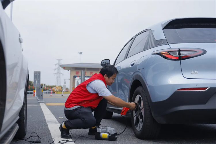 10月1日上午,一辆外地的小轿车停在九龙湖站外广场,只见司机神色焦急,眉头紧锁围着车辆查看。此时,正在综合服务站值守的“高速映山红”志愿者看到后,第一时间上前询问,司机告知因胎压警示灯亮起,担心行车安全,不得不靠边检修。