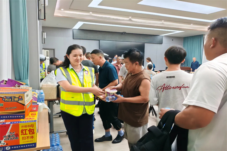 他们对会议室进行清扫消毒,摆放好座椅,并快步前往物资仓库,将汤面、方便面、矿泉水等食品和热水壶、纸巾等物品整齐摆放,仅20分钟便完成安置点布置与物资筹备。随后,工作人员引导滞留旅客有序进入会议室休息,逐一递上热饮和食物,轻声安抚大家情绪:“别着急,换乘车辆很快回来接你们,大家先吃点食物。”
