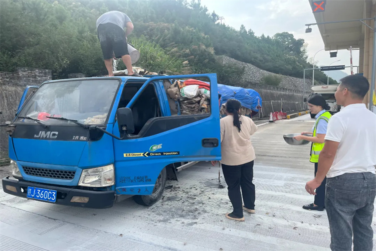10月1日16时20分,正值国庆车流高峰期,桐木站104车道内一辆货车发动机过热,伴随黑烟冒出,火情一触即发。在岗亭值守的工作人员第一时间察觉异常,立即采取行动:一边快速安抚车主情绪,精准引导其将车辆撤离至安全区域,一边通过对讲机向值班领导紧急汇报,随后准确报出事故位置,拨通火警电话。